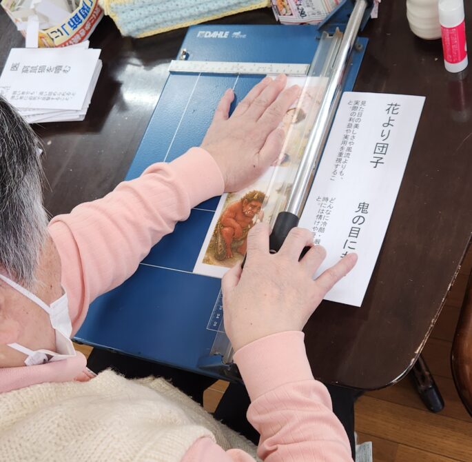 カード作りでは、利用者さまにもカット作業を手伝っていただき、みなさんで協力しながら準備を進めました。