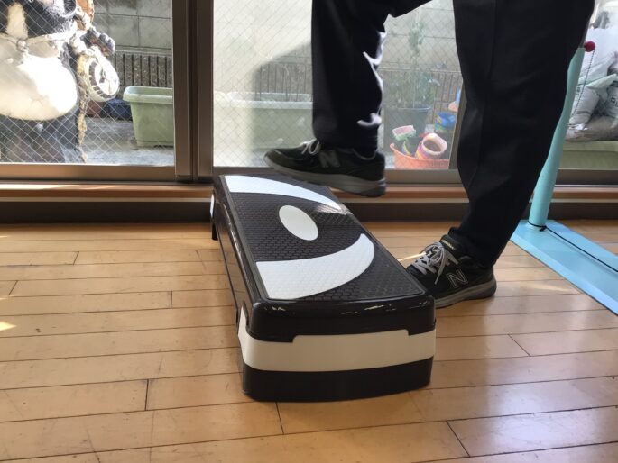 膝を高くあげ段差を登り、降りるを繰り返します。