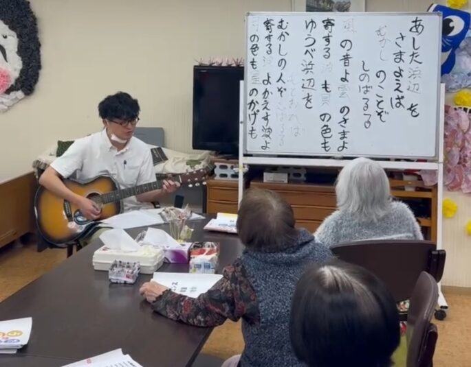 スタッフの中にギターを弾ける者がおり、タイミングが合う日はギターの生演奏にあわせて歌っています。やさしい音色に包まれながら、「高校三年生」や「あの鐘を鳴らすのはあなた」など、懐かしい名曲を口ずさむと、自然と笑顔があふれます。
