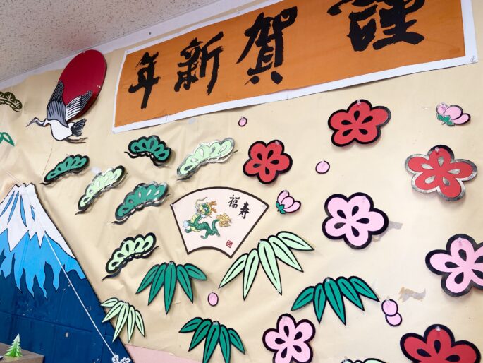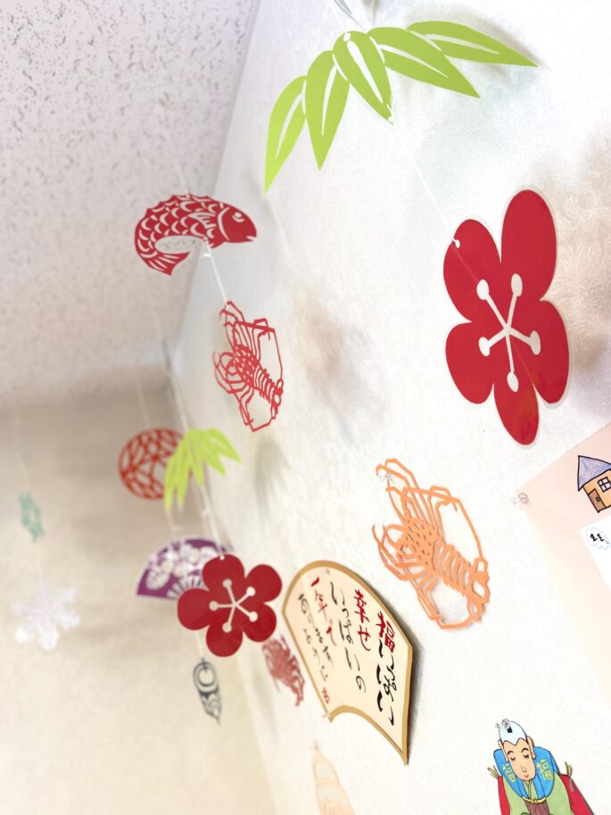 2024.01.11 カルナ西陣デイサービス 1月のデイルーム 毎月変わる壁画や装飾。楽しみにしてくださっている方もとても多いです。 1月は新年にふさわしく、とてもおめでたく華やか。 ゆらゆら揺れる吊るし飾りは、 松竹梅、まりに扇にこま、鯛に伊勢エビ 何と豪華なんでしょう! 見ているだけでも楽しい、素敵な作品。K様が切り絵で作ってくださいました。 ラミネートしたり、吊るし飾りにするために糸を結んだりする作業も、ご利用者様にお手伝いいただきました。 皆様、ありがとうございます。今月も福いっぱい幸せいっぱいのデイルームです。 前へ 次へ